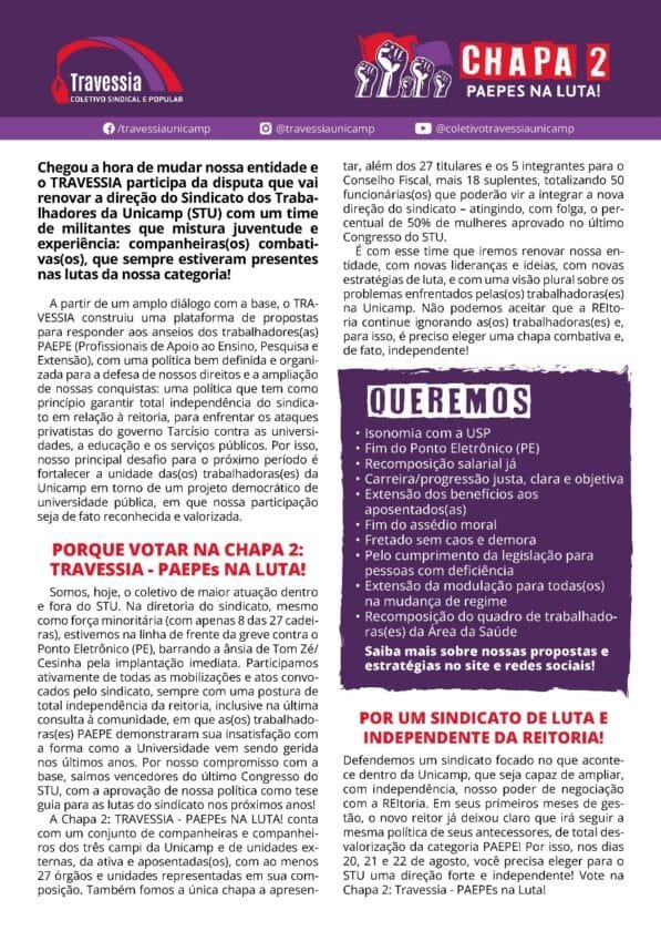 Boletim de Campanha 1 – Paepes Na luta – CHAPA 2 Publicado em 30/07/202507/08/2025 por travessiacampinas.com.brBaixe e compartilhe nosso boletim de campanha nº 1Pag1 – Paepes na LutaPag2 – Paepes na LutaOu baixe a versão em PDFBOLETIM JULHO – campanha 1-ONLINEBaixar