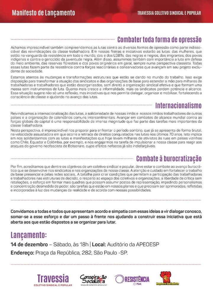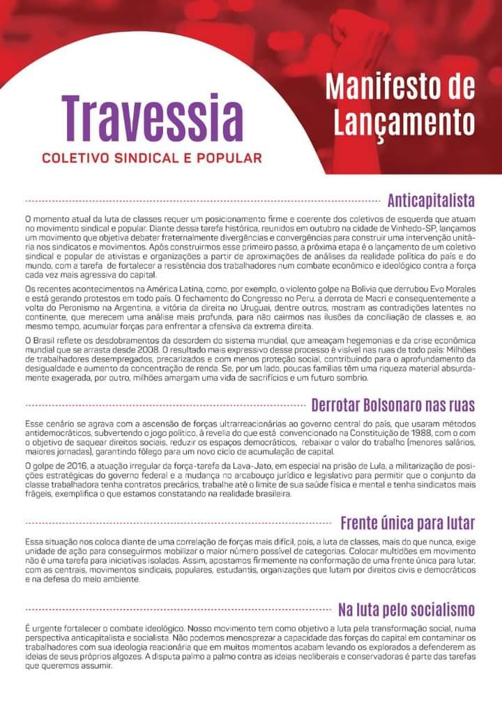 O Travessia – Coletivo Sindical e Popular foi criado em dezembro de 2019, quando ocorreu o lançamento de seu manifesto.